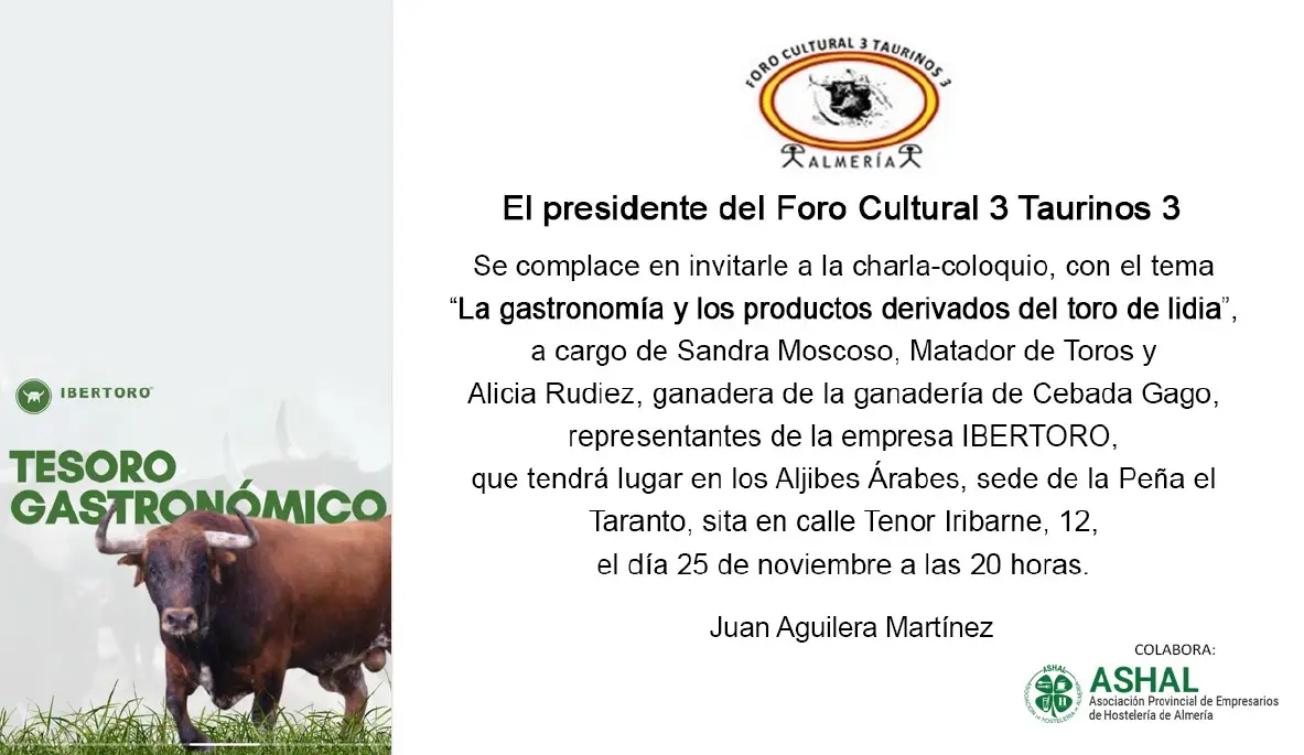 Se celebró, el martes 25, una degustación en el Mercado Central y por la tarde coloquio en los Aljibes Árabes, sede peña El Taranto coloquio «La Gastronomía y los productos derivados del toro de lidia” con Alicia Rudiez de la ganadería de Cebada Gago y la matador de toros Sandra Moscoso; este proyecto surgió a raíz de la pandemia con la creación de la empresa IBERTORO, dándole valor a la carne de toro y poder llegar a todos los hogares con distintos productos como Chorizos (natural o picante), salchichón o cecinas que posteriormente pudimos degustar como las exquisitas croquetas o el rabo de toro.